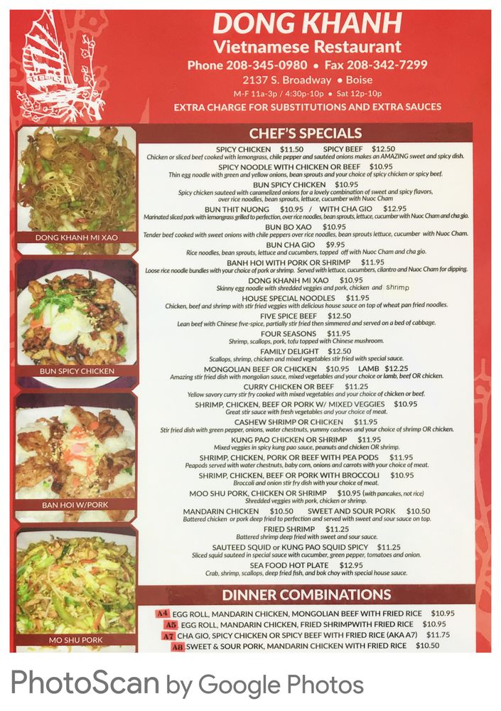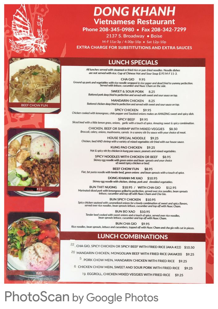 Discover the culinary delights of Dong Khanh Vietnamese Restaurant in Boise, Idaho. This casual and welcoming spot offers a variety of Vietnamese dishes, from flavorful pho to crispy cha gio. Customers rave about the attentive service and generous portions at this hidden gem. Try the pho with rich broth and tender meats, or opt for the cha gio for a crispy appetizer paired with fresh vegetables and dipping sauce. The menu boasts many vegetarian options and offers a great selection of dishes suitable for groups and kids. Don't miss out on the Hot and Sour soup if available, and be sure to ask about the spice level for a personalized experience. With its cozy ambiance and delicious offerings, Dong Khanh Vietnamese Restaurant is a must-visit for those craving authentic Vietnamese cuisine.